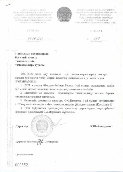 Приказ о бесплатном одновременном питании учащихся 1-х классов горячим питанием